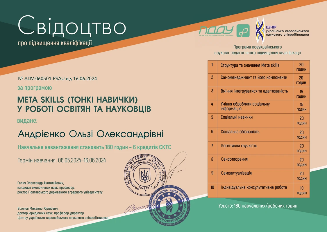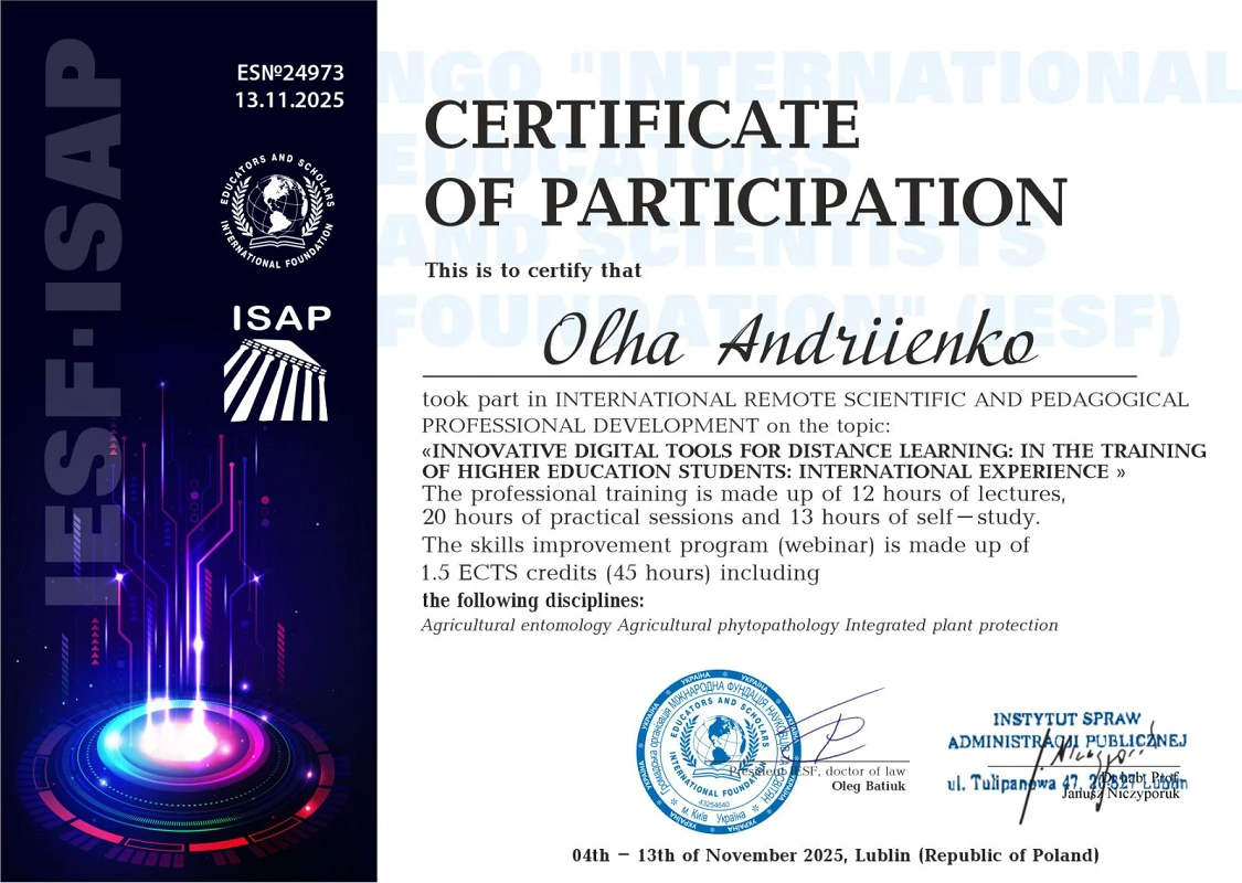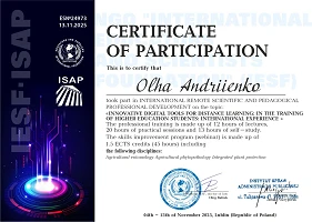 - Член Громадської організації «Українське товариство ґрунтознавців та агрохіміків» (Членський квиток ГО №14100857/018 від 24.02.2020).