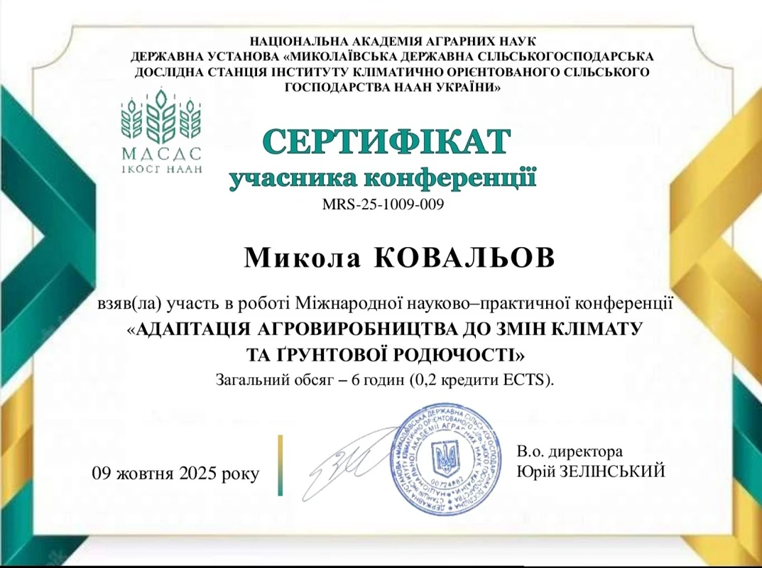 - Член ГО «УКРАЇНСЬКЕ ТОВАРИСТВО ГРУНТОЗНАВЦІВ ТА АГРОХІМІКІВ» Квиток № 14100857/012 від 24 лютого 2020 року