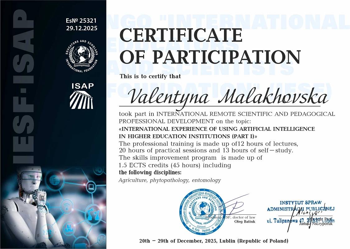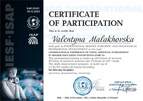 - Vasylkovska K., Andriienko O., Malakhovska V. and Moroz O. (2022). Analysis of changes in comfortable sunflower growing areas using the example of Ukraine. HELIA, 45(77). 175-189. (DOI: https://doi.org/10.1515/helia-2022-0010) (Scopus)