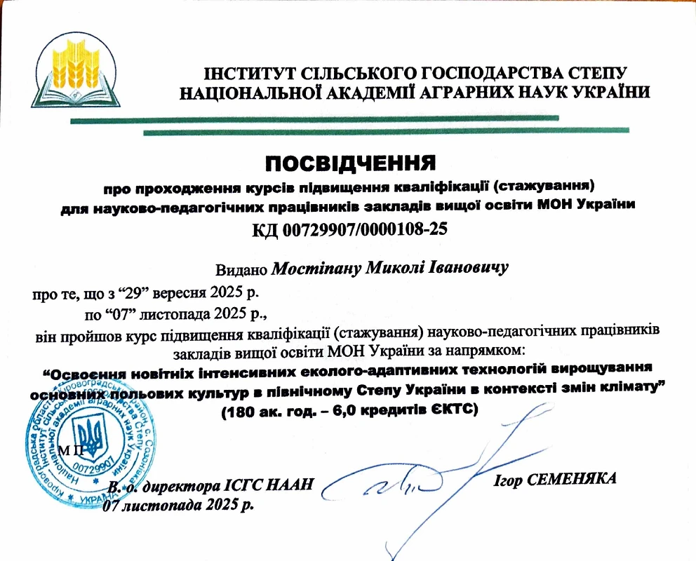 - Мостіпан М. І. Реакція пшениці озимої на час припинення осінньої вегетації в Північному Степу України. Вісник Полтавської державної аграрної академії. - 2019. - № 1. - С. 116-126.