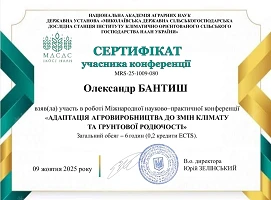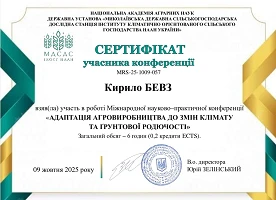 9 жовтня 2025 року на базі Миколаївської державної сільськогосподарської дослідної станції Інституту кліматично орієнтованого сільського господарства НААН України відбулася Міжнародна науково-практична онлайн-конференція «Адаптація агровиробництва до змін клімату та ґрунтової родючості». Здобувачі другого (магістерського) рівня вищої освіти кафедри загального землеробства Бантиш Олександр, Бевз Кирило та Колесник Костянтин разом з науковим керівником доцентом Миколою Ковальовим представили ЦНТУ на Міжнародній науково-практичній конференції «Адаптація агровиробництва до змін клімату та ґрунтової родючості», проходила в режимі онлайн на базі Миколаївської державної сільськогосподарської дослідної станції Інституту кліматично орієнтованого сільського господарства НААН України 9 жовтня 2025 року.