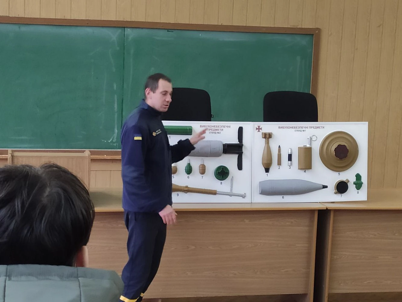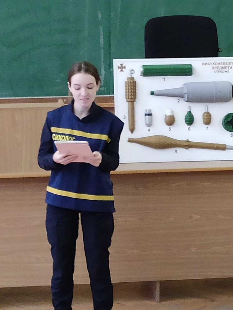 Сапер ДСНС представив алгоритм дій при виявленні вибухонебезпечних предметів і пояснив, як розпізнати застарілі та сучасні боєприпаси. Демонстрація натурних зразків допомогла здобувачам усвідомити реальні ризики та важливість зважених рішень у небезпечних ситуаціях.