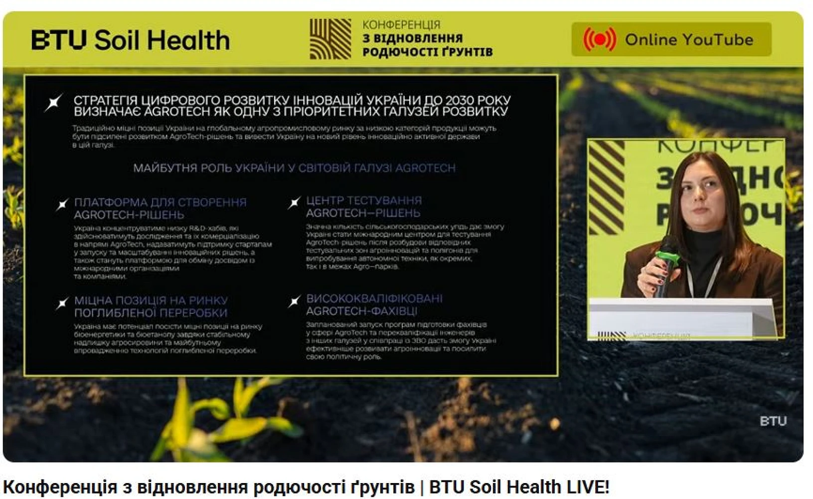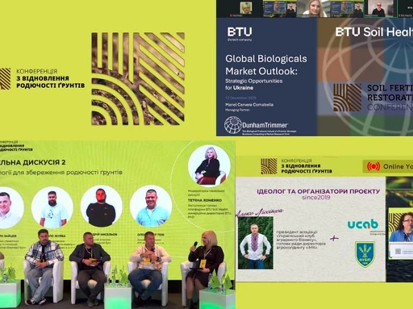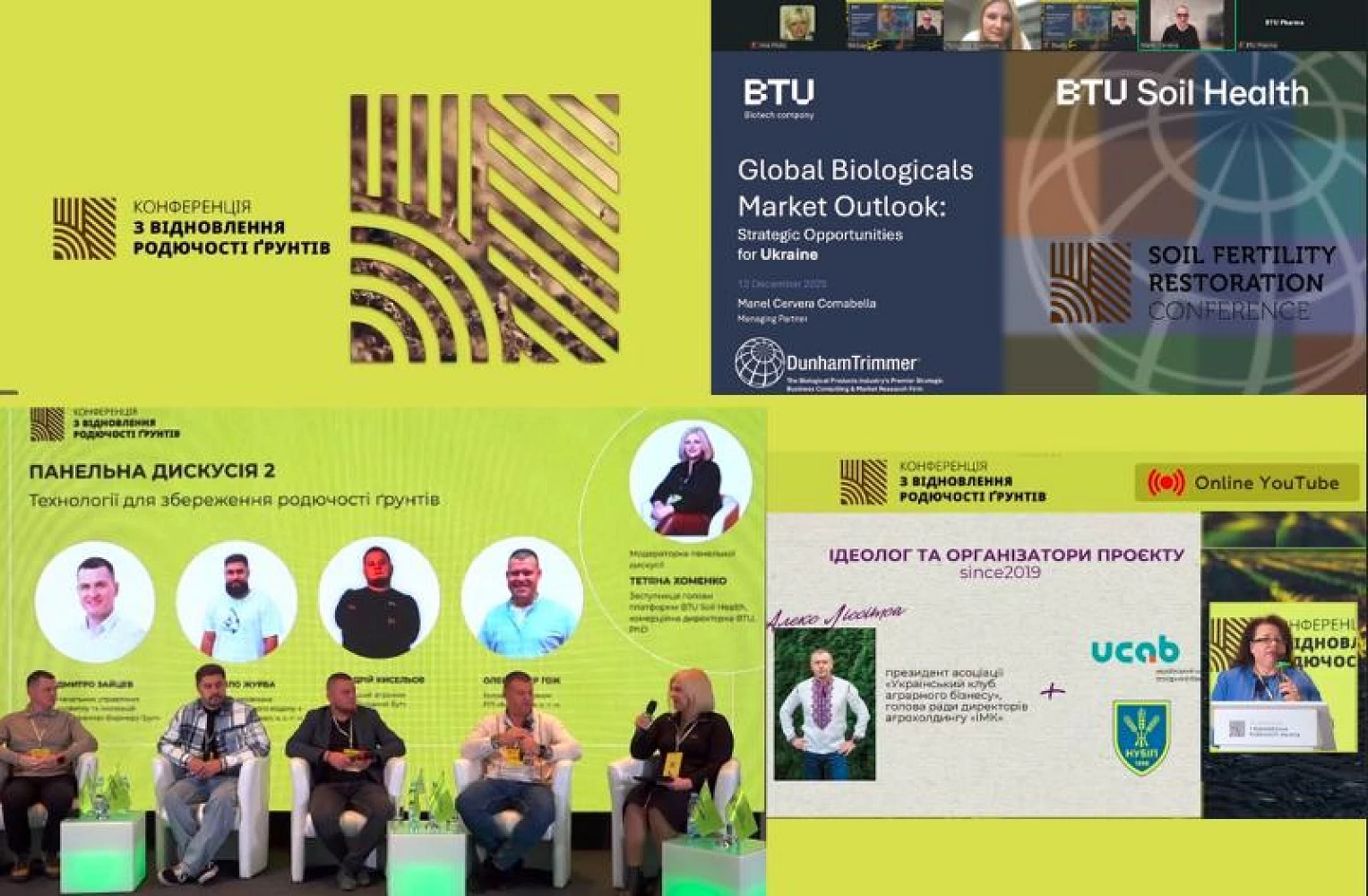 12 грудня 2025 року в онлайн-форматі відбулася VI Міжнародна конференція з відновлення ґрунтів на тему «Здорові ґрунти – здорове Агро», яку традиційно організовує Українська біотехнологічна компанія (BTU), що виробляє мікробні та ферментні препарати для сільського господарства. Захід був присвячений актуальним питанням збереження та відновлення ґрунтового здоров’я як ключової умови сталого розвитку аграрного виробництва та продовольчої безпеки, об’єднанню науки, освіти, бізнесу та влади для пошуку практичних рішень щодо збереження та відновлення родючості українських ґрунтів, зокрема після наслідків війни, з фокусом на свідоме управління та стійке сільське господарство.