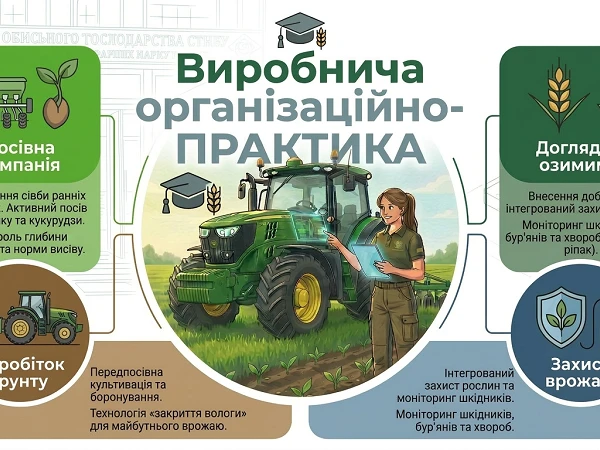 Виробнича практика студентів 4 курсу спеціальності «Агрономія» проходить у піковий період весняно-польових робіт, що дозволяє майбутнім бакалаврам опанувати повний технологічний цикл безпосередньо в господарствах. Наразі основна увага приділяється завершенню сівби ранніх зернових та активному посіву соняшнику й кукурудзи. Студенти беруть участь у передпосівному обробітку ґрунту, зокрема культивації та боронуванні для закриття вологи, а також контролюють якість роботи посівних агрегатів, дотримуючись при цьому норм охорони праці.