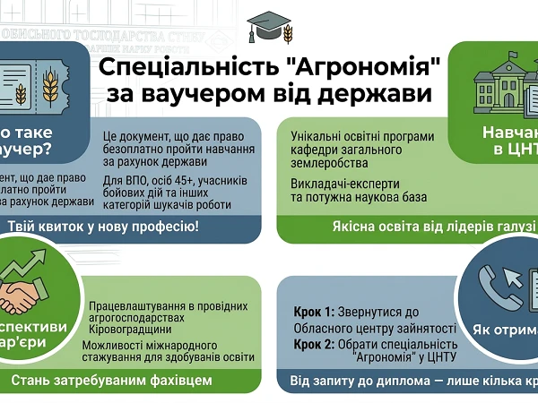 Цього тижня викладачі кафедри загального землеробства ЦНТУ долучилися до вебінару, організованого Кіровоградським обласним центром зайнятості для внутрішньо переміщених осіб, безробітних та роботодавців аграрного сектору. Під час зустрічі доцентки Віта Резніченко та Ольга Гелевера детально презентували спеціальність «Агрономія», акцентувавши увагу на можливостях безкоштовного навчання за державними ваучерами. Учасники заходу отримали фахові роз’яснення щодо того, як у стислі терміни опанувати нову затребувану професію відповідно до актуальних запитів сучасного ринку праці регіону.